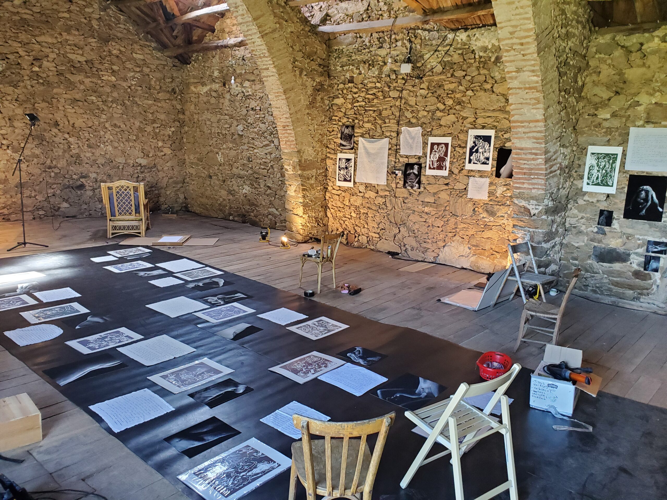 D nu·e·s D, c’est une salle mosaïque où, pour chaque modèle, il est possible de voir une combinaison de photographies, linogravure, textile et d’écouter leur enregistrement audio au casque, un témoignage multi-focal, manifeste de leur dénudation originale pendant qu’il-elle posait en studio. Peut s’ajouter à cette expo une salle immersive, évocation audio-visuelle intime, organique, de l’espace de captation et du vécu des modèles sujets.